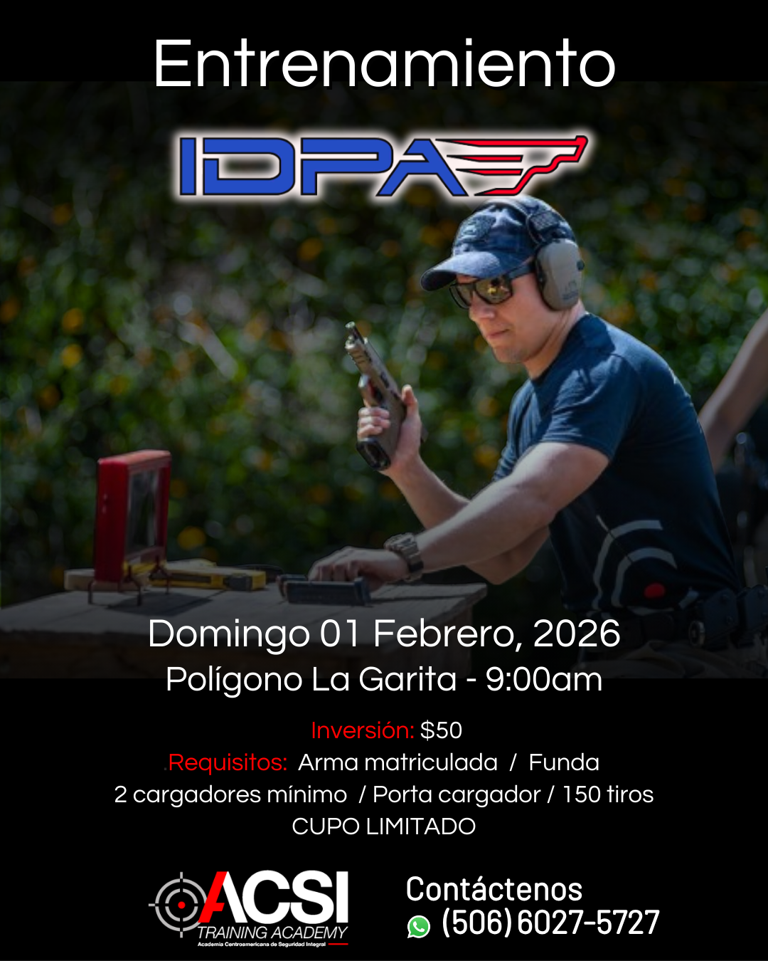 Práctica IDPA Requisitos: Arma matriculada Dos cargadores mínimo Funda Porta cargador 150 tiros Inversión: $50 CUPO LIMITADO RESERVE SU CUPO AQUÍ + Add to Google Calendar + iCal export Date Feb 01 2026 Time 9:00 am - 12:30 pm Costo $150 Más información Pago reserva Location Polígono La Garita Alajuela Category Competencia Entrenamientos dirigidos Pistola Pago reserva Share this event